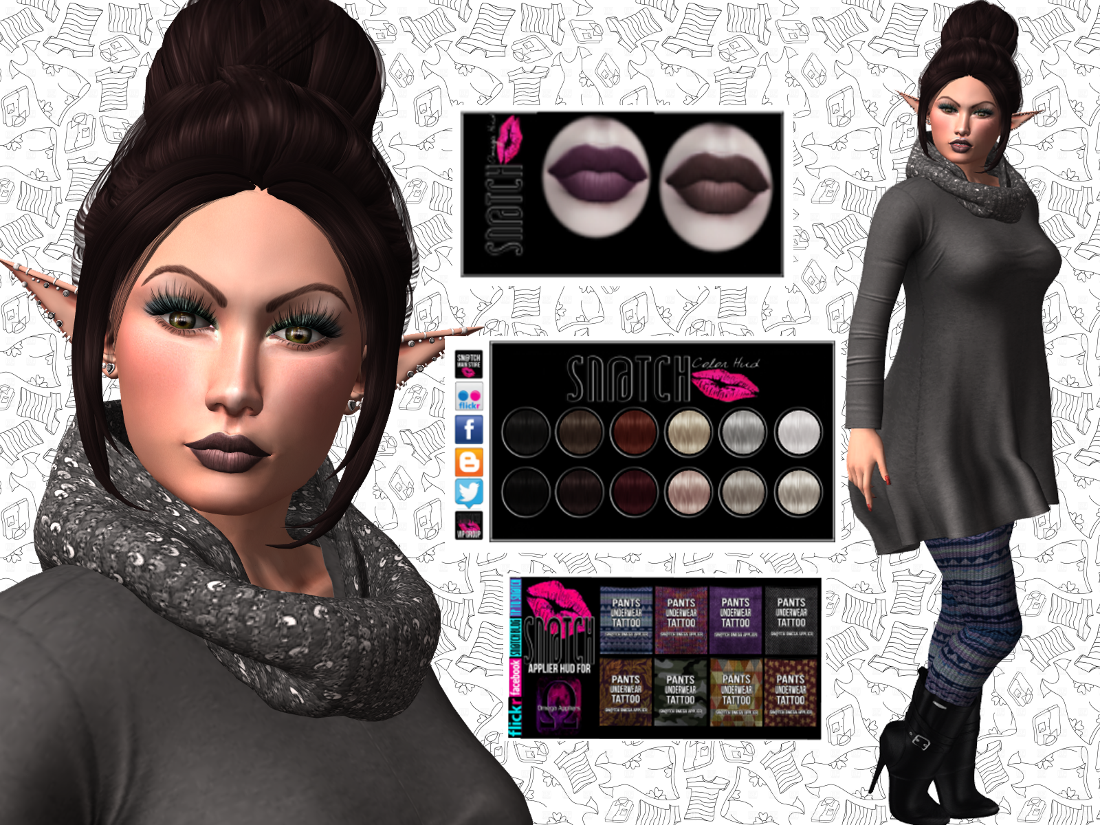 So many cute and sexy things to buy at Sn@tch but first I made sure I ready and comfortable in my new outfit I got fishing at Sn@tch. This rounds Sn@tch Fish 4 This set is called: “Baby, It’s Cold Outside.” It comes packed full of amazing goodies. There is an updo hairstyle with a 12 color palette, cute boots, leggings in 8 patterns: both applier and system,* mesh tops, 3 scarves, 2 different lipsticks. As always at Sn@tch you get clothing for Classic and mesh bodied avatars.