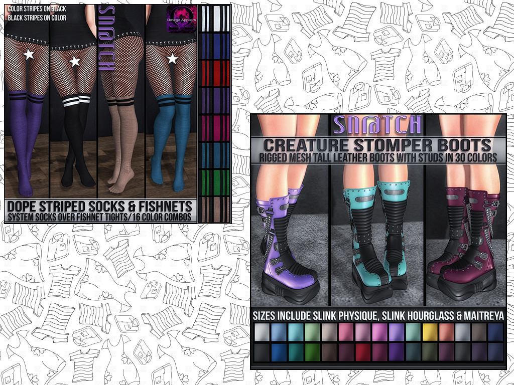 I pair this with the new “Creature Stompers” from Sn@tch. I love how they make me taller than normal but are colorful enough to pair with all my outfits. Covered in chains and studs the uppers come in 30 colors and only three sizes…remember about demoing! This note from the Designer (the Maitreya size fit my Belleza Isis perfectly with alpha cuts!)