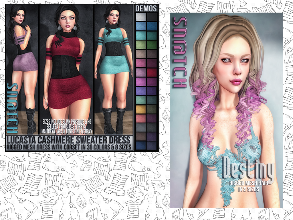 Next is the sexy “Lucasta Cashmere Sweater Dress.” This cozy, clingy dress from Sn@tch is super short! There is a corset waistline, small capped sleeves, and a turtlenecked collar. The HUD comes in 30 colors and there are 8 sizes. (oh when I said short, I mean, if you’re timid, wear some knickers)