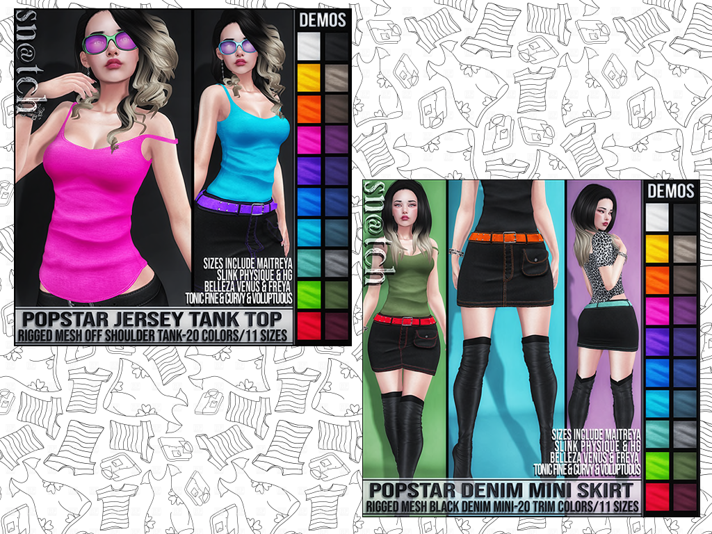As pretty much always I was comfy in my haul from Sn@tch. So let’s get right into it. Starting from the top, the new hair I am wearing is called ” Callie.” The crips center part that flows down over your shoulders with some nice fringy bangs. It comes in all the great Sn@tch colors and there is always a free demo to try! Next, I had to have these matching pieces called “Popstar Jersey Tank Top” & “Popstar Denim Miniskirt.” These bright pieces are perfect together in so many ways. The tank comes in a tucked and untucked version to work with the mini. There are 20 colors and 11 sizes for this cool for the summer