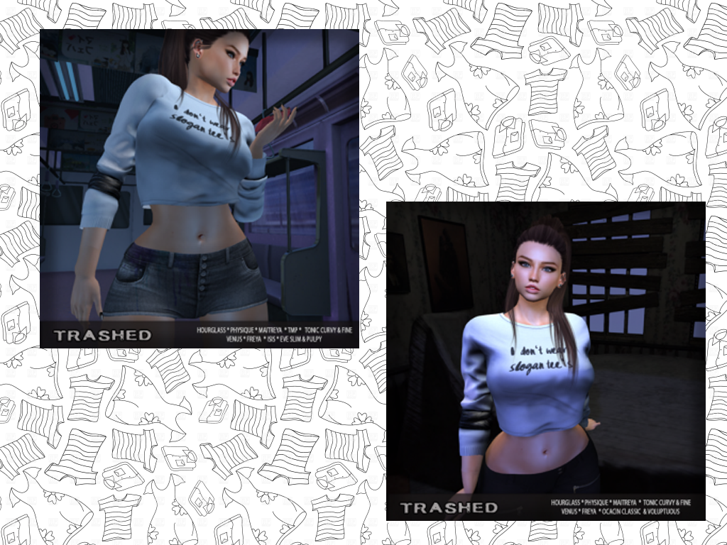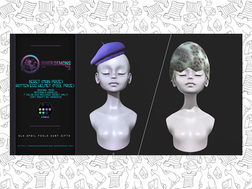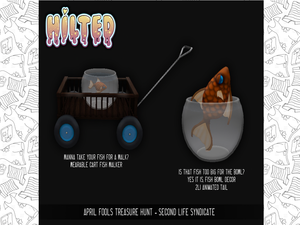 All these great items are part of the hunt, top to bottom: the super cute beret is from {Inner Demons}. With a seven-color HUD included, this is a cute addition to any wardrobe. Check out the “Rotten Egg Helmet“, too! Then there is the sweet top and shorts from Trashed. I fell in love with the “Paynt” shorts and the “No Slogans” Shirt. Both these pieces come in tons of body types and are gonna be a part of my SL attire all summer long. Last but definitely not least, is this super fun gift from Hilted. The “Pet Fish” cart is perfect for getting your finny friends out of the house for some fresh air. There is also another item from Hilted that might have you making an emergency run to the pet store!