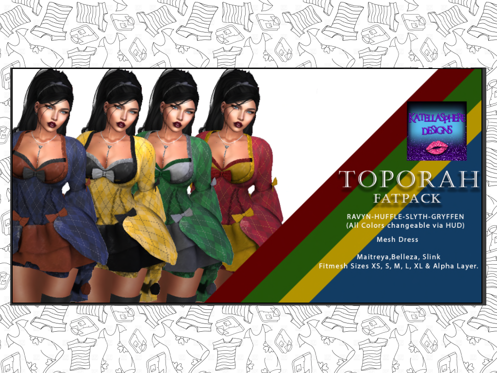 The gorgeous dress I am wearing is from Katellasphere Designs. The Toporah fat pack is full of color variations of this sweet dress. It was hard to pick which one to feature. The themes are based a bit on the house colors in Harry Potter.